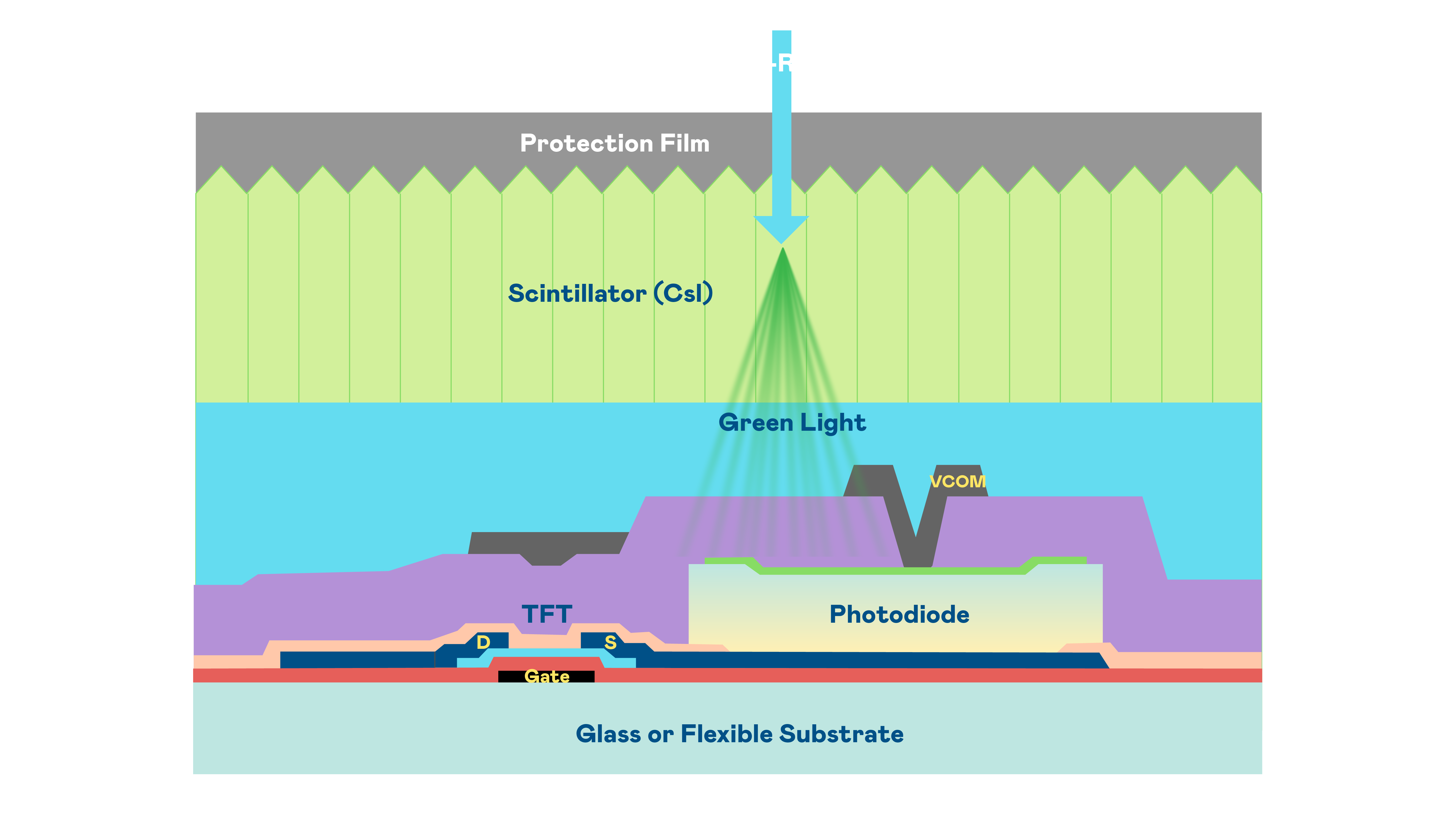 太阳成集团tyc151cc的X光影像感測陣列使用薄膜電晶體 (TFT) 作為每個像素的讀取開關,搭配光電二極體(Photodiode)的光電轉換元件,用以感測X光影像訊號。